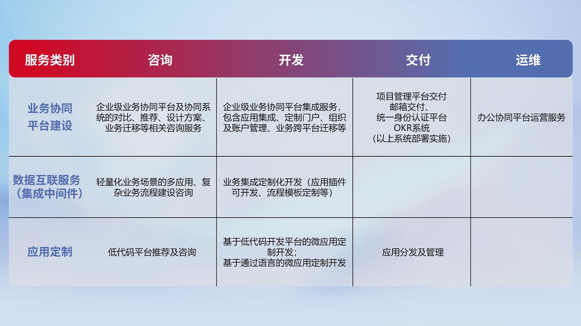 针对钉钉、、企微、、IDaas等平台级产品提供产品的规划、、、、方案、、、交付、、、、定制化开发等服务,,,,实现如统一协同办公、、智能客户服务、、、混合会议管理、、智能数据查询、、等业务场景,,,,实现数字化转型。。
